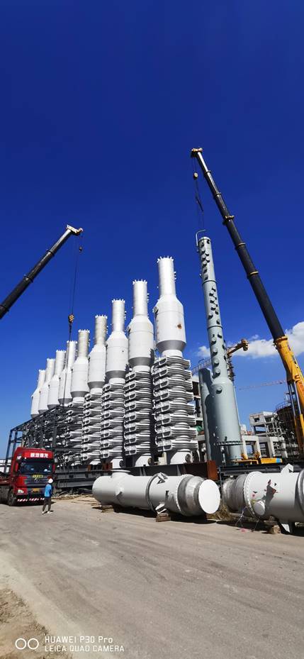 七月的驕陽似火,興華科技公司聯堿現場的設備安裝也正在經受這盛夏的考驗,炎熱的天氣,擋不住興華科技員工的工作熱情,經過前期的精心準備,由三門峽化機制造的聯堿大型塔器碳化尾氣凈氨塔、濾過尾氣洗滌塔、濾過尾氣凈氨塔、和淡液蒸餾塔以及煅燒爐氣洗滌塔等塔陸續進廠,經過相關部門領導的統籌協調,分兩次將7臺大型塔器全部安全吊裝到位,至此聯堿重堿現場的所有塔器全部安裝完成,為下一步的管道安裝打下了堅實的基礎。
